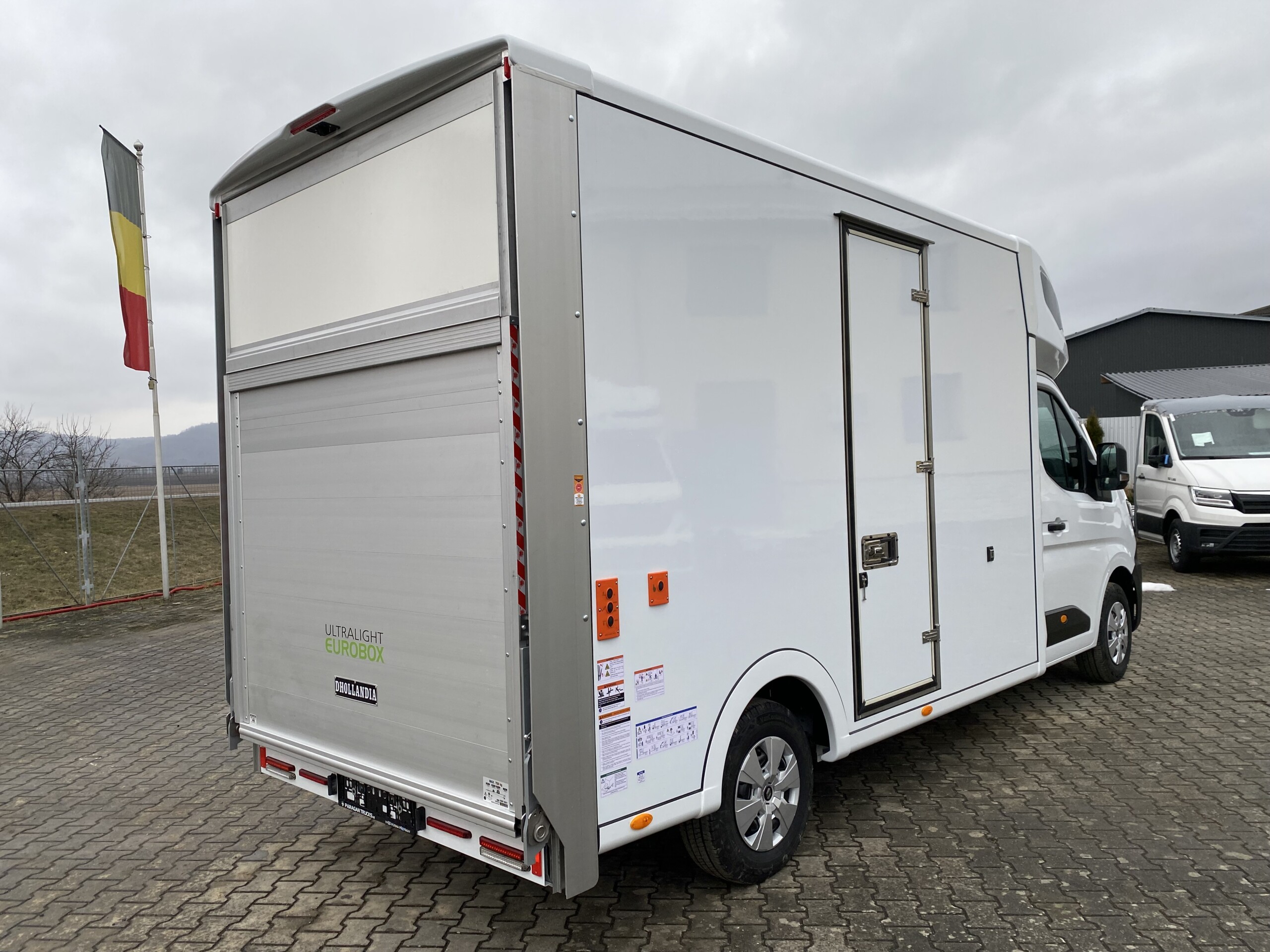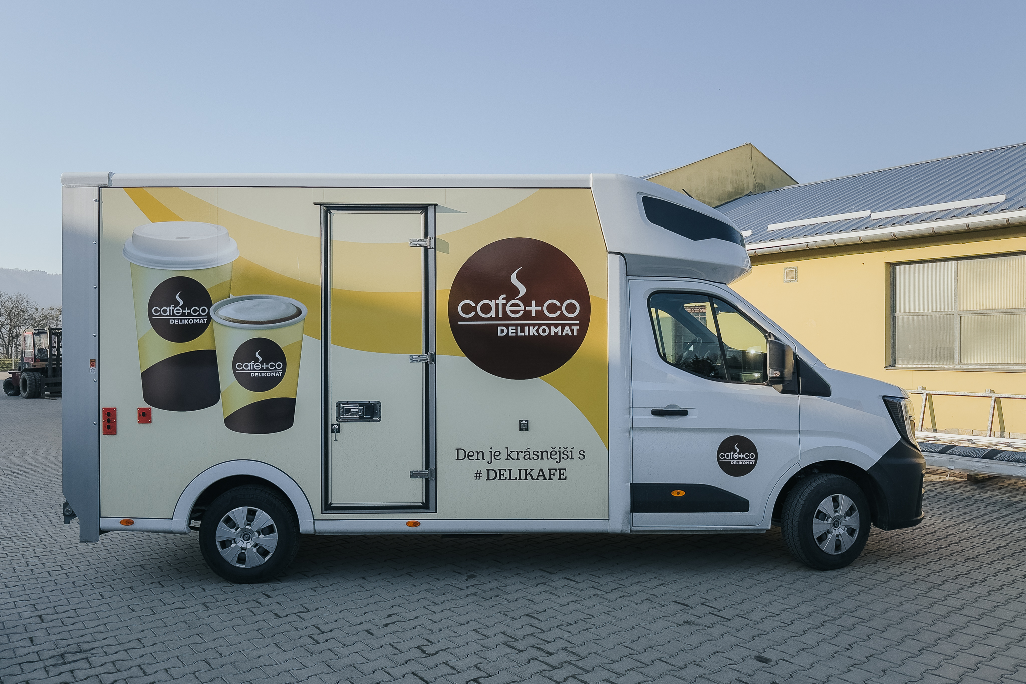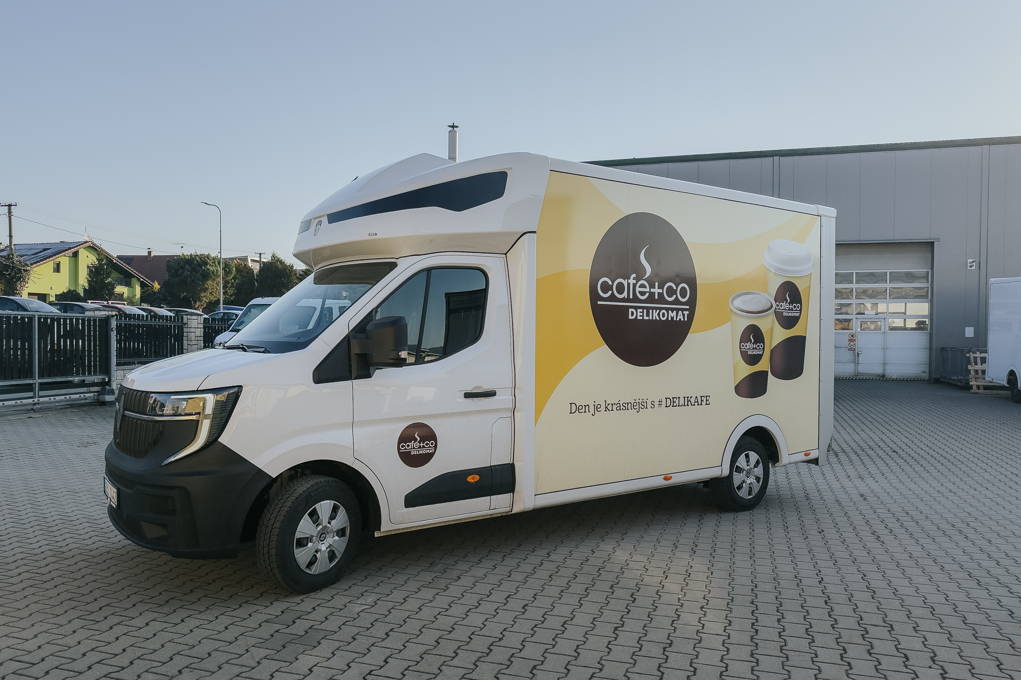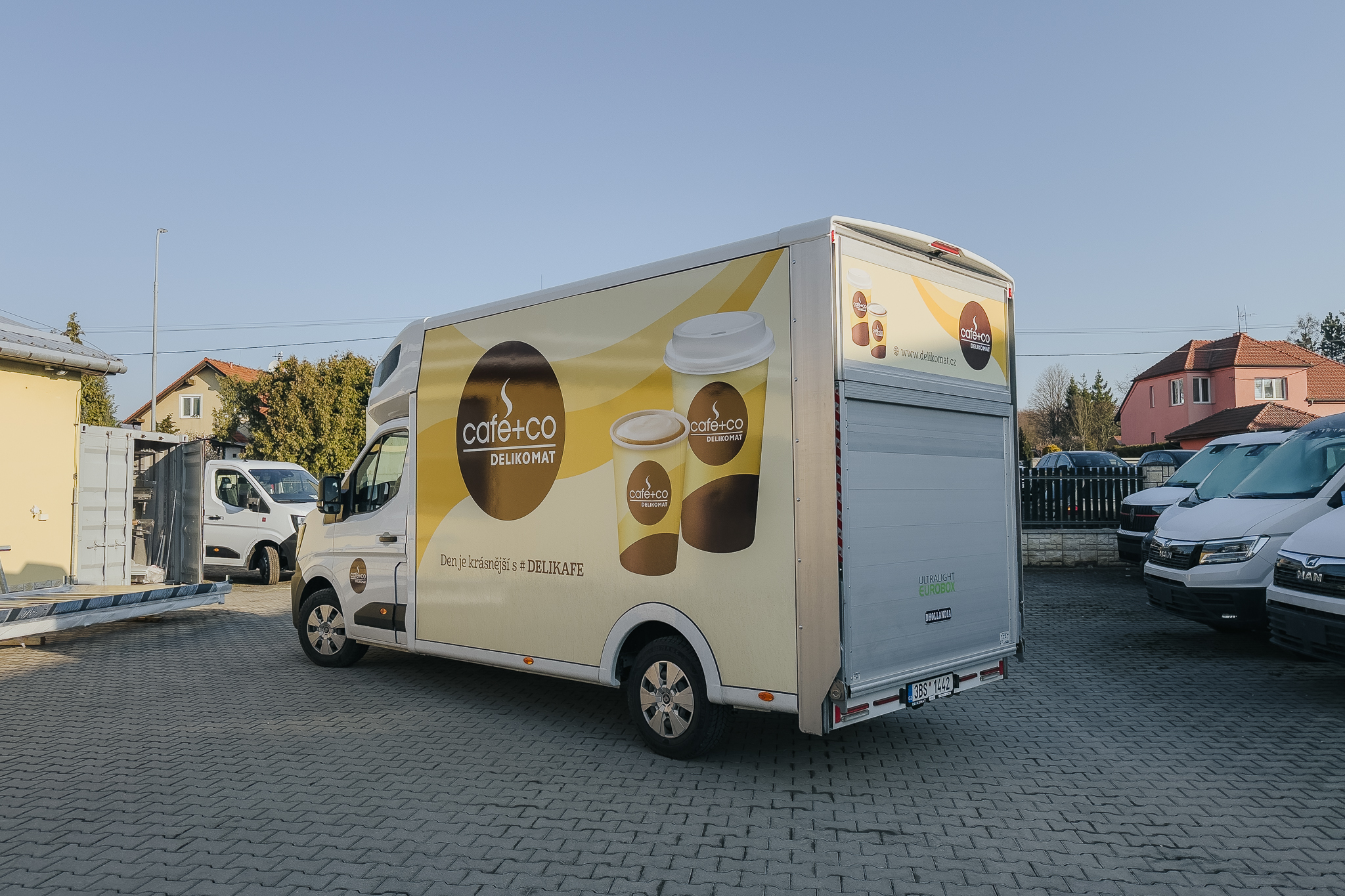 Na podvozku Renault Master vyrostla nástavba Eurobox XL IZO s hydraulickým čelem a bočními dveřmi šířky 700 mm. Tuto nástavbu bude využívat firma Delicomat Café+Co. Uvnitř nástavby se nachází 2 řady trimovacích lišt, AIRLINE lišta, okopový pás z překližky + obložení překližkou, překližkové latění, ALU kryty podběhů a hliníková konstrukce pod stropem nástavby. Na autorádio jsme připojili couvací kameru.