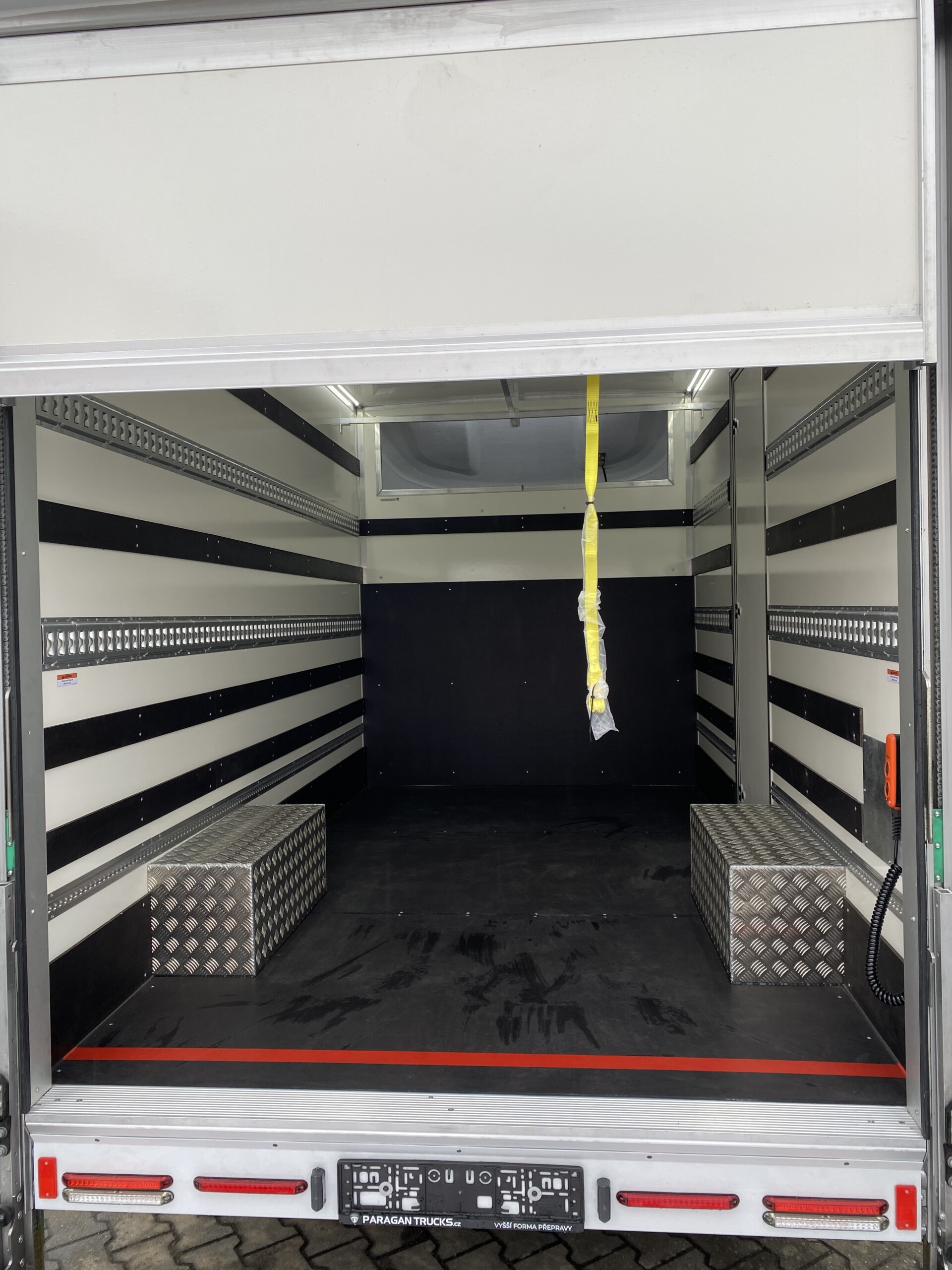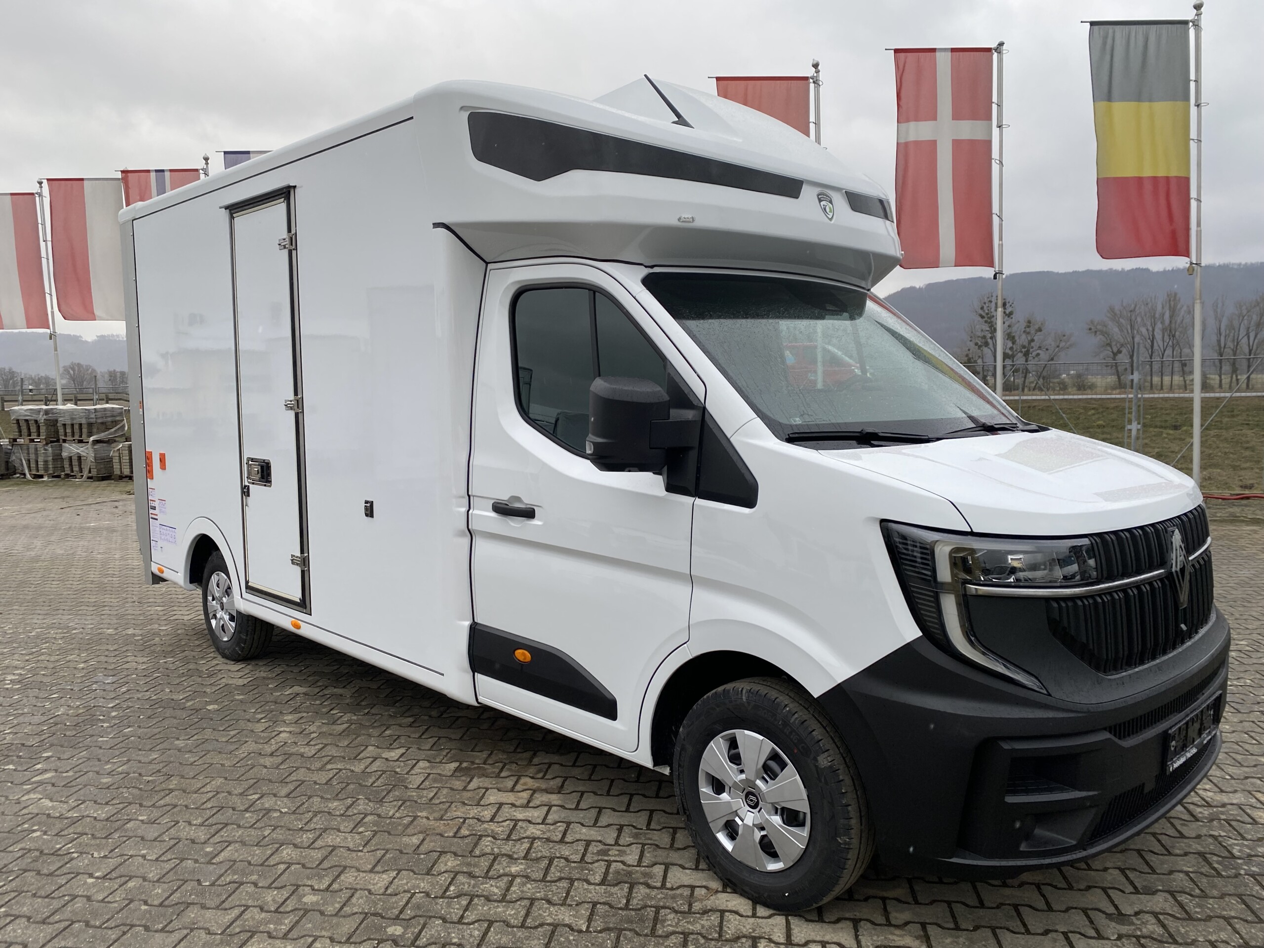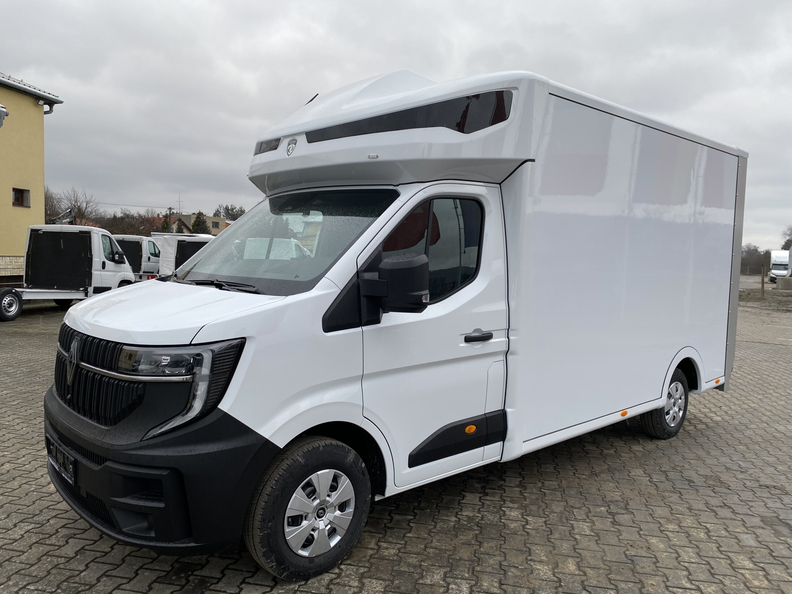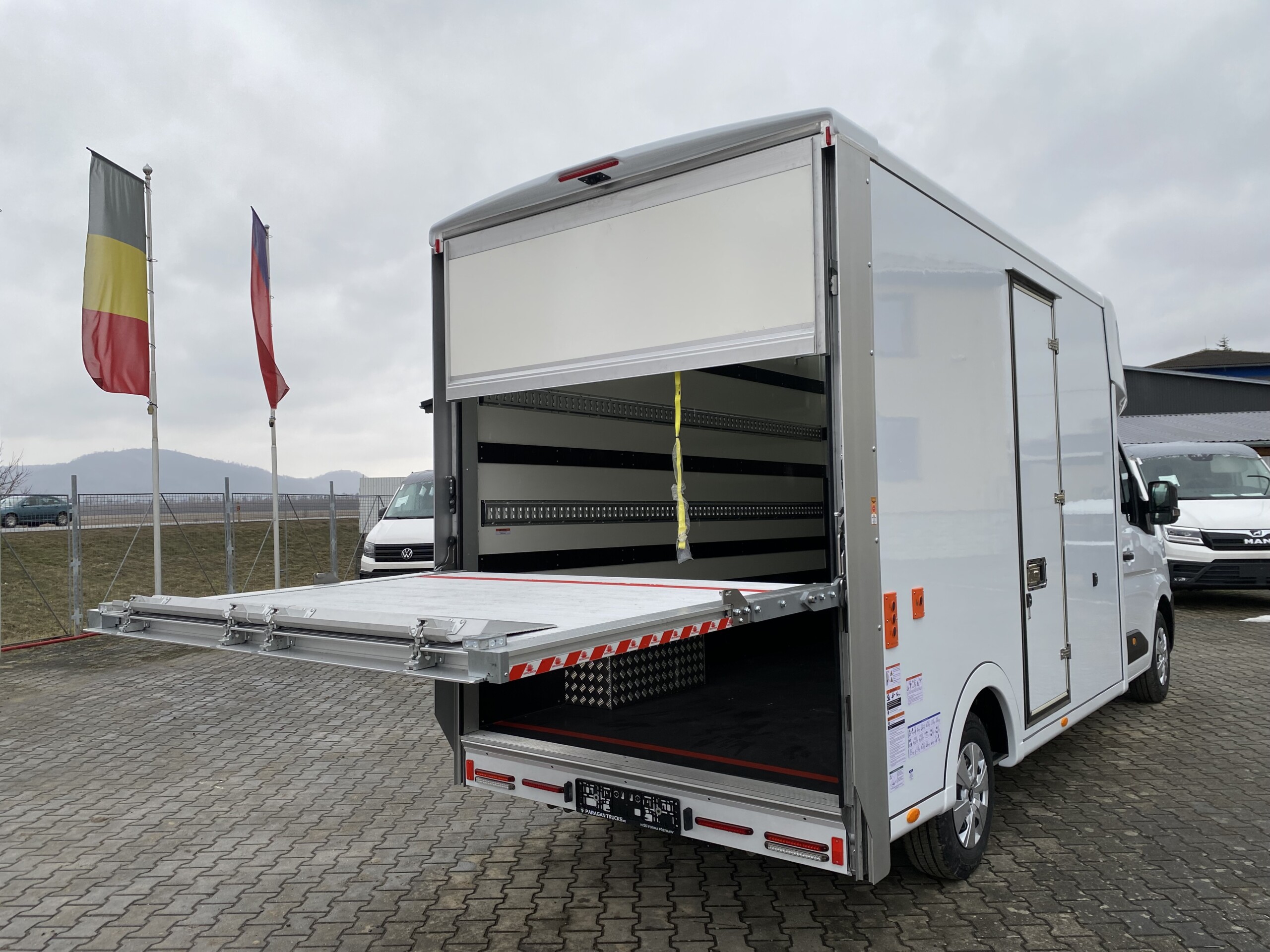 Na podvozku Renault Master vyrostla nástavba Eurobox XL IZO s hydraulickým čelem a bočními dveřmi šířky 700 mm. Tuto nástavbu bude využívat firma Delicomat Café+Co. Uvnitř nástavby se nachází 2 řady trimovacích lišt, AIRLINE lišta, okopový pás z překližky + obložení překližkou, překližkové latění, ALU kryty podběhů a hliníková konstrukce pod stropem nástavby. Na autorádio jsme připojili couvací kameru.